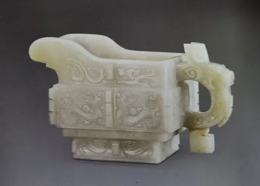 匜( yí)是先秦时代礼器之一,提到青铜匜往往把其作为西周中期应沃盥(wò guàn,浇水洗手)之礼而诞生的水器。匜在不同时期有其不同的功能,作为水器的情况最多,也曾作为酒器存在过。明代玉匜更多是作为仿古陈设器出现,展示了明代制玉工艺的高水平。